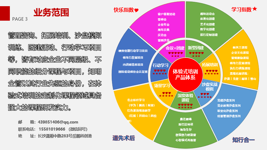 湖南知明企业管理咨询有限公司,下辖管理咨询事业部、体验教育与团建策划事业部 、 沙盘训练事业部、 红源文化事业部、大型活动事业部 等五大核心业务板块,致力于为客户提供高附加价值的培训服务与团建活动解决方案,助力客户组织效能提升,支持客户企业持续成长,推动创造企业和团队的全新价值。知明人以强烈的使命感和团队致胜的共识为基石,踏踏实实做人,认认真真做事,历经多年成功实践,积累了包括金融、IT、互联网、机械制造、食品、教育、医药、石油、化工、传媒、通讯、商超等多个领域的丰富培训经验,整体培训品质处于同行业领先地位。 知明企管秉持道先术后、以道驭术的理念,已为省内外8000多家企事业团队成功实施创新迭代的知明管理训练课程、创新团建活动、党建系列服务与行动学习项目,获得客户的深度认同和广泛赞誉。